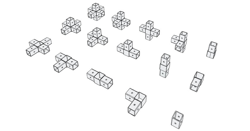 L’unione tra gli elementi avviene tramite giunti ad incastro disponibili in versioni a 2, 3, 4, 5 e 6 vie, che consentono infinite possibilità di configurazione.